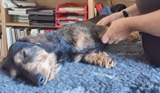 Smärtlindrande massage och beröring är viktigt för hundens välmående. Massagen ger smärtlindring genom ökad insöndring av oxytocin och endorfiner.
